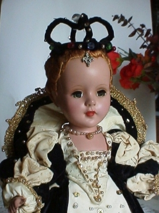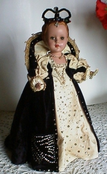 She's a strung 14" Sweet Sue but with a floss wig. She's marked AC on the back of her head and the same model doll as the previous one. Her outfit is fascinating. I don't know if this was dressed for a pageant or special event or if she was dressed by a very talented mommy, but the outfit looks factory. The sequins on the gown are hand sewn and the black velvet has rhinestones set into it with prong backings. In her hand is the scroll she gave to Christopher Columbus. However she came to be, she truly is a very special doll. Value: $250.00+
