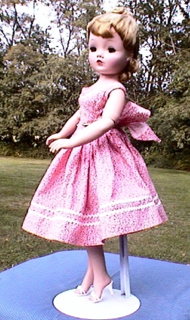 She's hard plastic with vinyl arms. Red and white cotton pique daytime dress. All original Value: $600.+