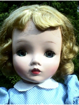 From the mid 50s, she's all hard plastic except for vinyl arms with are jointed at the elbows. Also jointed at the knees. All original and very close to mint.