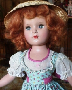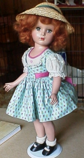Another Margaret face, 16" and strung. Her wig is flaming red mohair. The dress is not tagged but the outfit could be original. I gave her the hat although it has the wrong color hat band. It holds her thick hair down until I decide how I want to do it. A doll with some real possibilities from the McMaster's Treasure hunt.