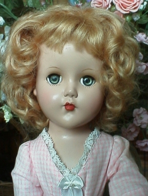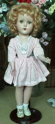 This was my first Arranbee doll. She has a mohair wig and when I got her, I didn't know all the pitfalls of washing mohair. Since then I learned how lucky I was! The wig is short and in excellent condition to it stood up to washing, brush out and setting. It's very soft and wonderful but i've since found that doing this has a success rate of about 10%. So for every mohair wig you find that will take this treatment, ther will be at least nine that will fall apart. Her dress may be original, it fits her perfectly and is a light cotton print with an attached slip. Her oilcloth shoes are center snap and showing their age. The doll is strung and in wonderful condition.