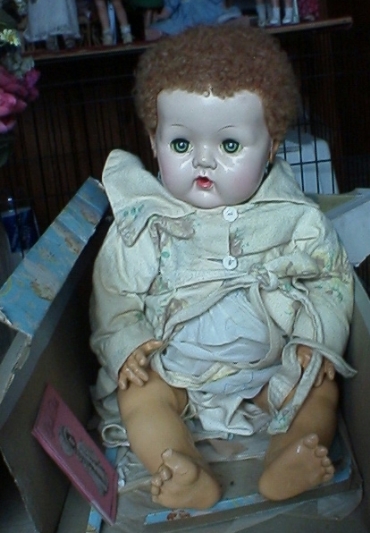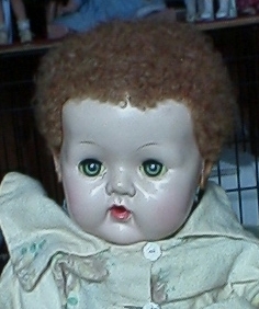 Here's Effanbee's answer to American Character's Tiny Tears and Ideal's Betsy Wetsy. All were first made in the early 50s with hard plastic heads and rubber bodies. All were drink/wet dolls. Tiny Tears has holes between the inside of the eyes and the nose that were tear ducts. Dy Dee's identifying feature is rubber ears set into the hard plastic. Some had lambskin wigs and some had molded hais. This one is all original and in excellent condition. Usually the rubber bodies have periched by now and become at least crazed and usually dried out and collapsed. SHe even still has her box.