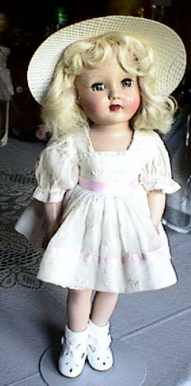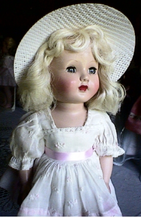 This platinum blonde hard plastic doll is Tintair (tint hair) Honey. She's a strung doll, 14" tall. She's Effanbee's answer to Ideal's Toni doll that was sold with a home perm kit that was really just shampoo and miniature curlers. Honey's hair is white and she was originally sold with curlers and hair dye that would wash out. This one is wearing her original white organdy dress with embroidered pint flowers. I added the hat which I'll trim to match the dress eventually and make her a pair of shoes that aren't so bulky. She's from about 1952.