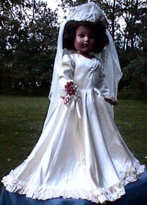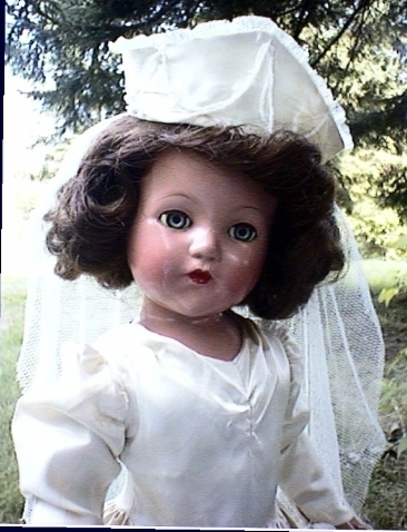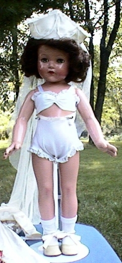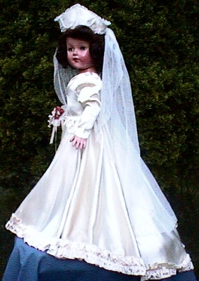 This sweet bride is another Anne Shirley. She's 22" tall and all original. The simple line of the gown is truly elegant. It is of cream satin with no lace or tulle. The trim on the cap of the veil is a double string of seed pearls draped in a "W" and a delicate lace edging. The long veil is cotton tulle, the shoes are off-white satin ties, and she wears rayon socks; not hose. Notice her underwear. Her panties and bra are cotton crepe with ribbon roses. The bra straps are white satin. Very close to mint, she's now a part of Cecile Tenery's collection. Value: $400.