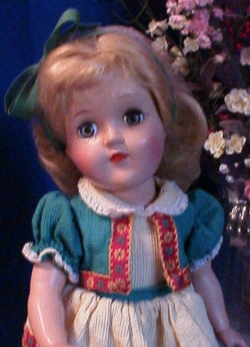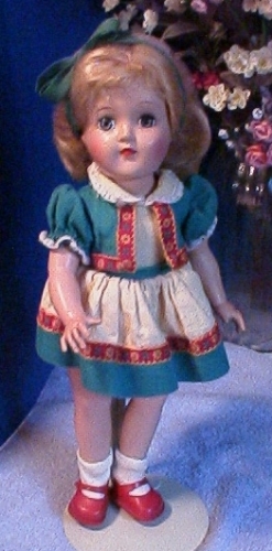 Here's an all-original golden blonde. Her dress is a waffle weave cotton pique. She has her original vinyl side button shoes and fairly high blush which would date her around 1954. The doll is perfect.