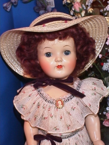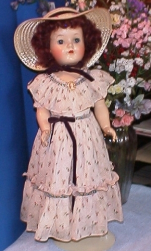 This doll is from 1948 and uses the Toni mold before there was a Toni doll. Her wig is the softest auburn mohair and she's 19" tall. Her gown is very similar to the gown used by Ideal on the Judy Garland doll. Her slip has a hooped skirt. Her hat, shoes and underwear are replacements as close to those pictured in Hard Plastic Dolls by Polly and Pam Judd. Doll and dress are in excellent condition.