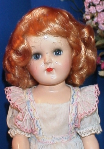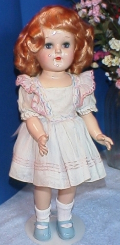 Here's a very rare Toni with bright strawberry blonde hair and aquamarine eyes. Her dress is pale blue cotton organdy with pink, blue and yellow embroidery. It's just like the one on the platinum blonde in the photo directly above her in the galery, except that one is pink.