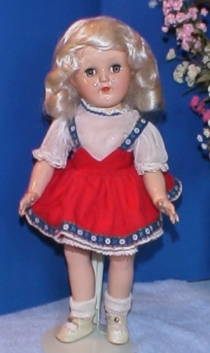 Here's a gorgeous blonde. She's all original in her red and white dress that simulates a skirt with shoulder straps and a shear blouse. Her dress is tagged and has the attached slip.