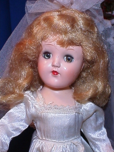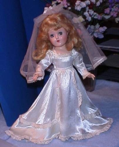 Here's another bride. This one is a later version than my original one, I think because the later Tonis had brighter sheek color. She has hoony blonde hair that is more coarse than the wigs on the others, so this one may be been parketed as "Sara Ann". Her markings are the sale as the others, however.