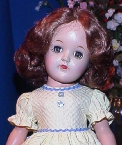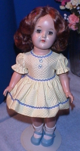 This Toni has medium length hair that is a gorgeous chestnut brown. Her eyes are also brown and he face paint is perfect. I made her blue center snap oil cloth shoes and her dress is a yellow waffle weave cotton with blue rickrack. It's an excellent reproduction of an original Toni dress made by Toni Wear. Her socks are old store stock Rayon.