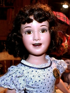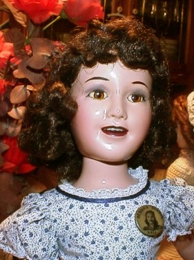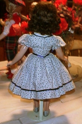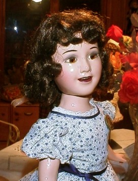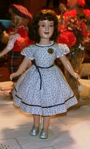 This is a protrait doll of a movie star of the 30s and 40s. She's a comtemporary of Judy Garland and a doll very similar to this was made of Judy. She's redressed here but besides gowns and costumes like Gulliver of Gulliver's Travels> she was sold in daytime frocks similar to this. She's been completely restored (by me) and in this condition her value is about $300.