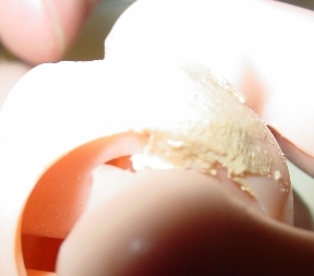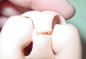 Now with the toothpick I put the mixture into the split, making sure it goes in all the way to the paper and out on both sides. With a wet finger, I tamp it down to be sure it's in contact with all the surfaces that need to be closed. |