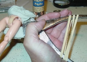 I'll be using Plastic Paste for this repair. It's gooey and to keep it from getting into the hip joints, I put a tiny strip of heavy paper under the split. I used a straight pin to push it in and under the crotch so the two sides of the split are not covered. |