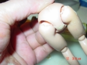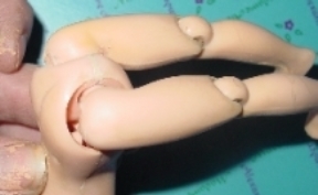 Ever notice how at a doll show, there's always someone like this in a group of lookers. Some look at the face first, some at the hair or thr clothes. Some look for a maker's mark. But this one always lifts the skirt first. So, just in case she's ever exposed to this kind of person, I airbrushed the mend to make it invisible. I used the acrylic bisque paint that comes in the little 2 oz bottles mixed with the acrylic gloss varnish (about 2 parts paint to 1 part varnish). This duplicates the translucent look of the plastic. There are several flesh tones available and since these dolls all have faded or aged to different colors, I can't tell you for sure which to use. |